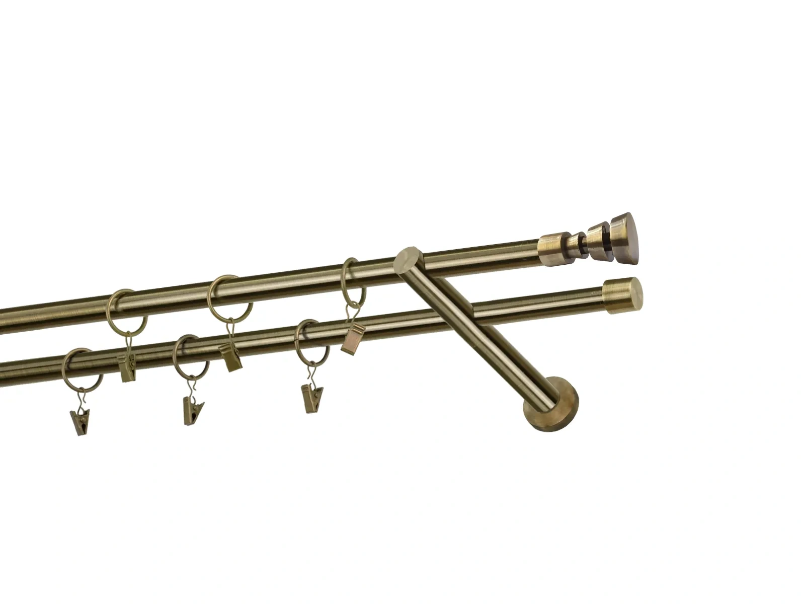Felületkezelt kétsoros fém függönykarnis antik (matt arany) árnyalat. Minőségi galvanizált fém függönykarnisok. A galvanizálás nagyobb felületi szilárdságot, nagyobb karcállóságot és sima felületet biztosít. Készletként szállítjuk.
