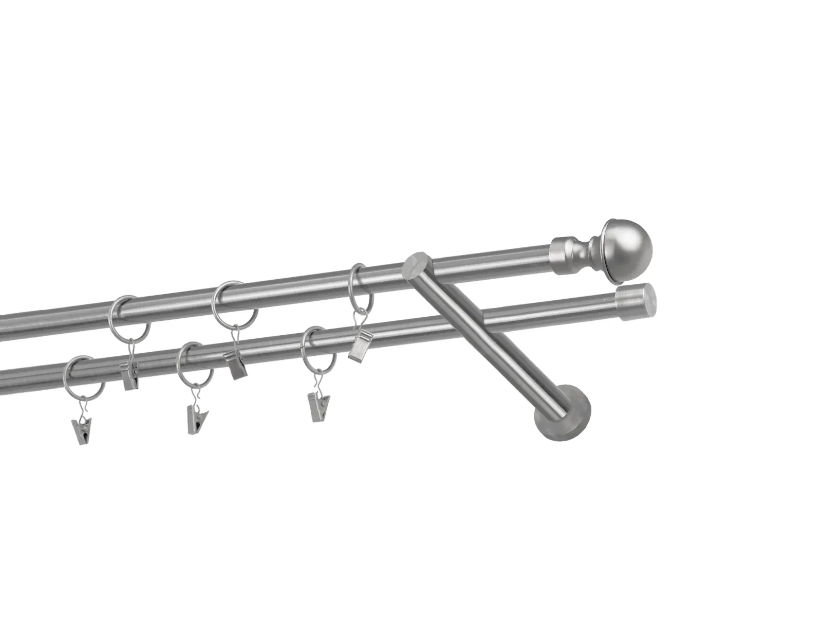 Felületkezelt kétsoros fém függönykarnis satin (matt nikkel) árnyalat. Minőségi galvanizált fém függönykarnisok. A galvanizálás nagyobb felületi szilárdságot, nagyobb karcállóságot és sima felületet biztosít. Készletként szállítjuk.