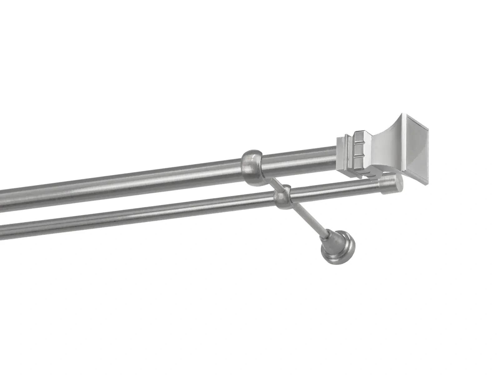 Felületkezelt kétsoros fém függönykarnis satin (matt nikkel) árnyalat. Minőségi galvanizált fém függönykarnisok. A galvanizálás nagyobb felületi szilárdságot, nagyobb karcállóságot és sima felületet biztosít. Készletként szállítjuk.
